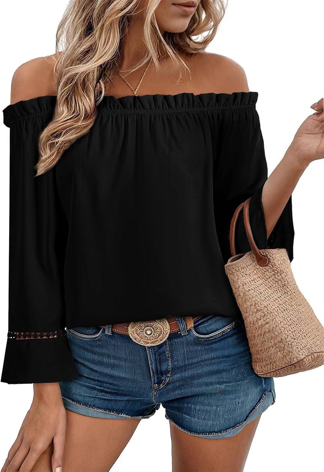 EVALESS Womens Tops Off The Shoulder Blouses for Women Dressy Casual Cute 3/4 Ruffle Sleeves T Shirts Fashion 2026
