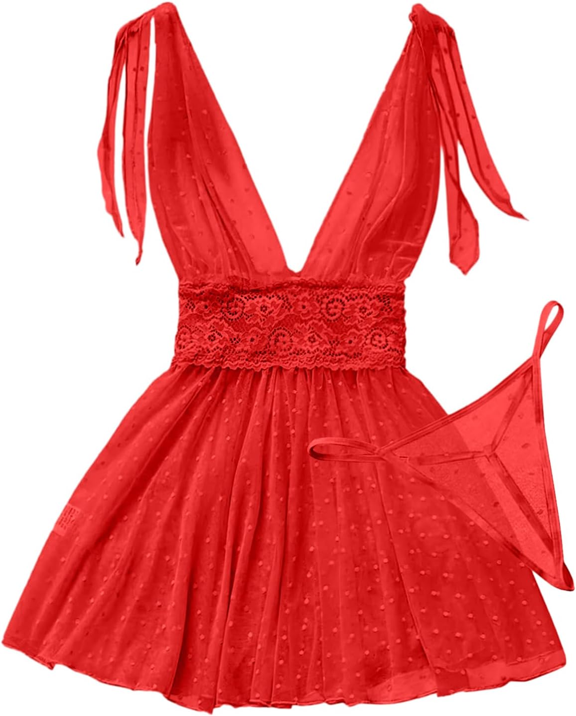 Sexy V Neck Slip Mesh Polka Dots Floral Lace Sheer Exotic Babydoll Lingerie Dress 2 Piece