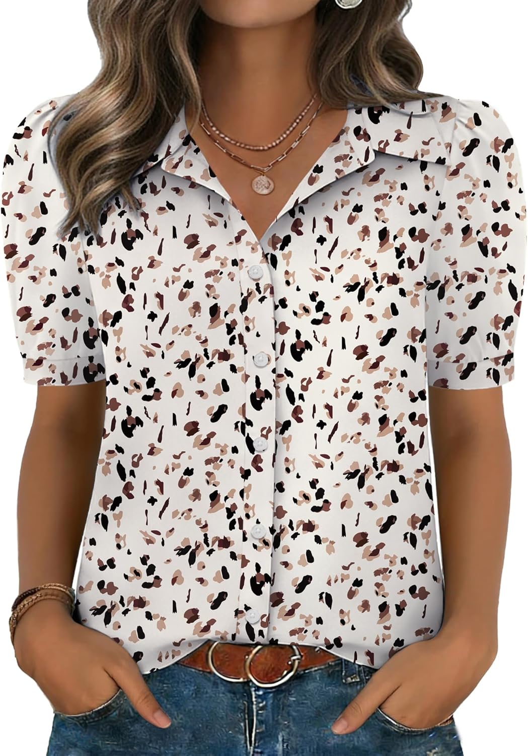 Zeagoo Women Button Down Shirts Puff Short Sleeve Blouses Chiffon Tops Business Casual Outfits Summer Clothes
