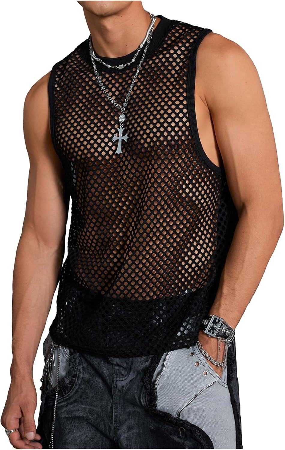 OYOANGLE Men's Mesh Fishnet Tank Top Sleeveless Crew Neck See Through Muscle Tops Clubwear