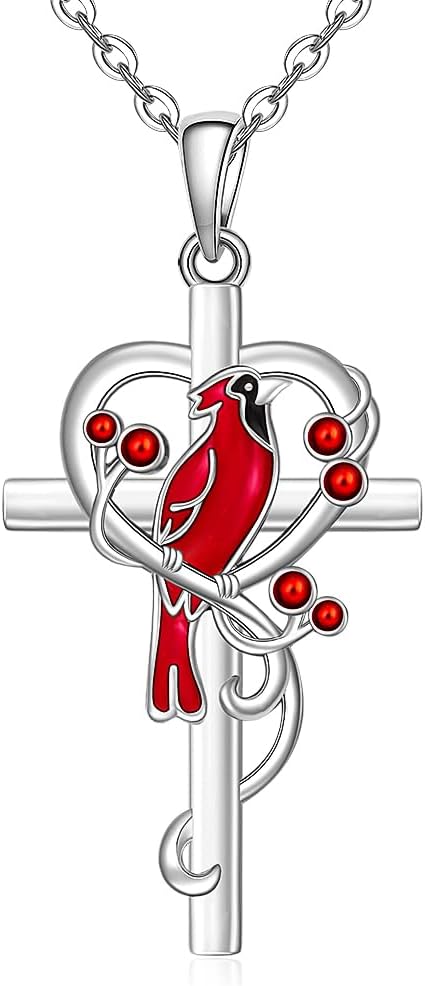 Cardinal Necklace for Women 925 Sterling Silver Cardinal Heart Pendant Necklace Cardinal Cross Necklace Memorial Gift for Women