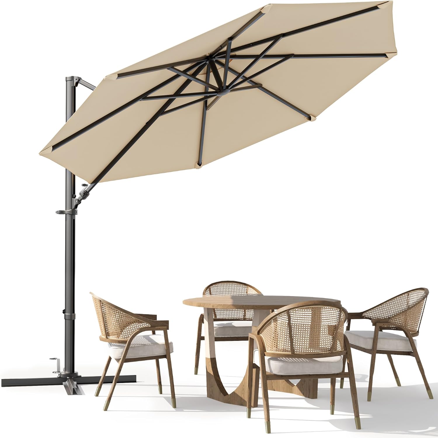 Greesum 10FT Outdoor Patio Umbrella with High Pedel and 4 Gear Heights, Large Offset Market Umbrella with 360-degree Rotation, Without Base, Hanging Outdoor Shade for Garden, Lawn, Pool, Beige