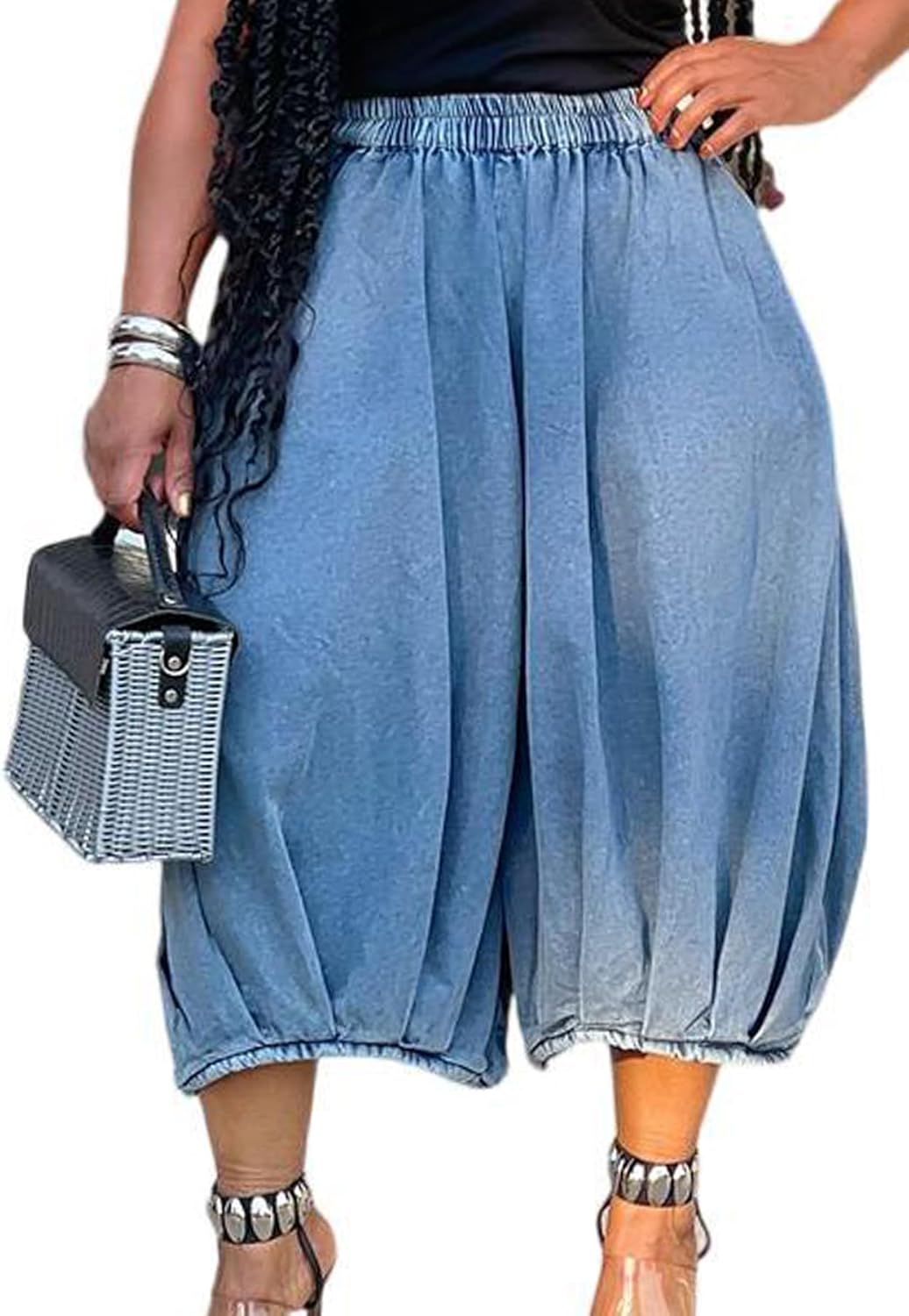 Molisry Women's Denim Harem Pants High Waisted Elastic Y2K Loose Fit Wide Leg Baggy Capri Jeans Casual Streetwear