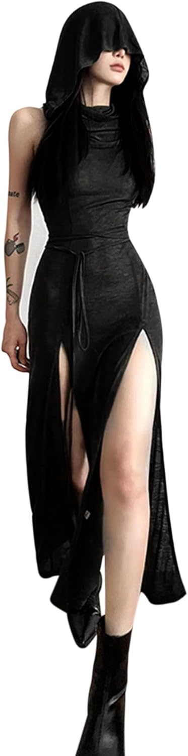 Women's Gothic Sleeveless Hooded Dress Y2K Side Split Hollow Out Midi Dress Bodycon Cocktail Party Club Dresses