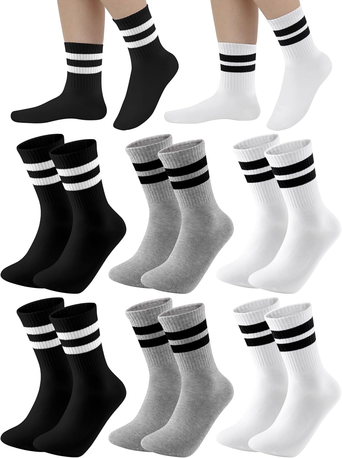 Cooraby 6 Pairs Unisex Kids Crew Socks Boys Girls Athletic Socks with Retro Stripes Soft Cotton Socks Black White Grey