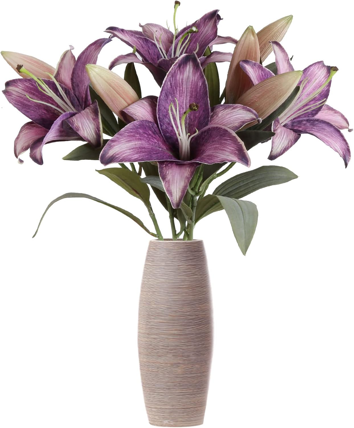 - 【Size and Quantity:】The fake lily flower height 20.86inches/53cm; lily flower diameter: 5.9”/15cm. A bloom purple flower and a flower bud with 4 green leaves consist of one single stem. Each package includes 5pcs fake lily fake flowers. Our purple artificial flowers bulk lily flowers are great for your silk flowers floral arrangement.
