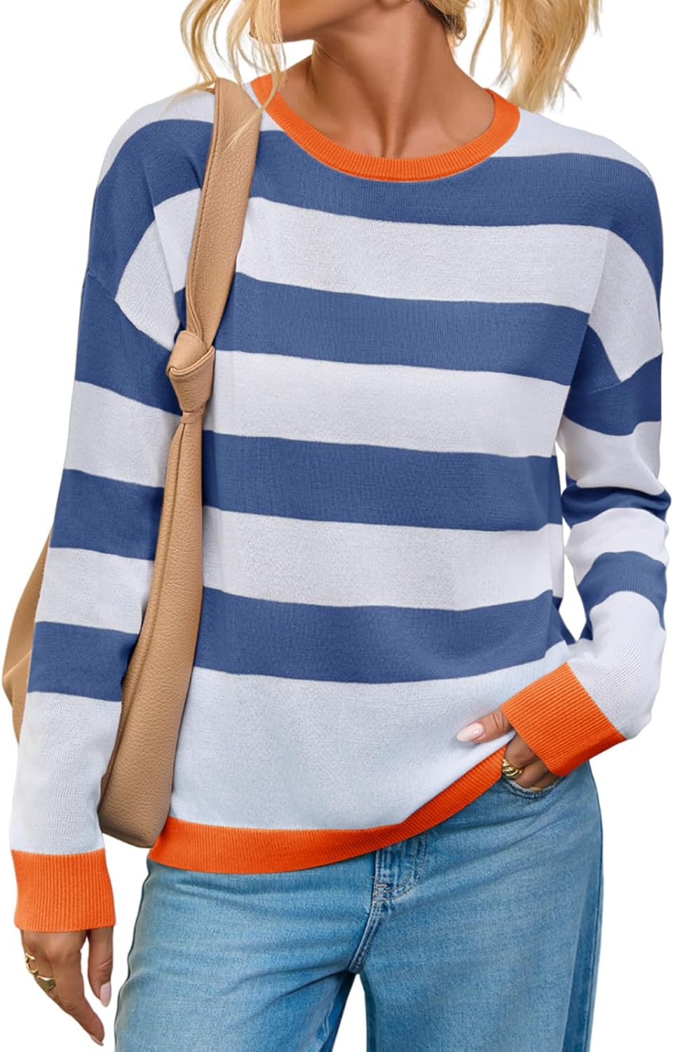 Yousify Womens Long Sleeve Color Block Shirts Casual Loose Fit Striped Tops Knit Lightweight Pullover Sweaters