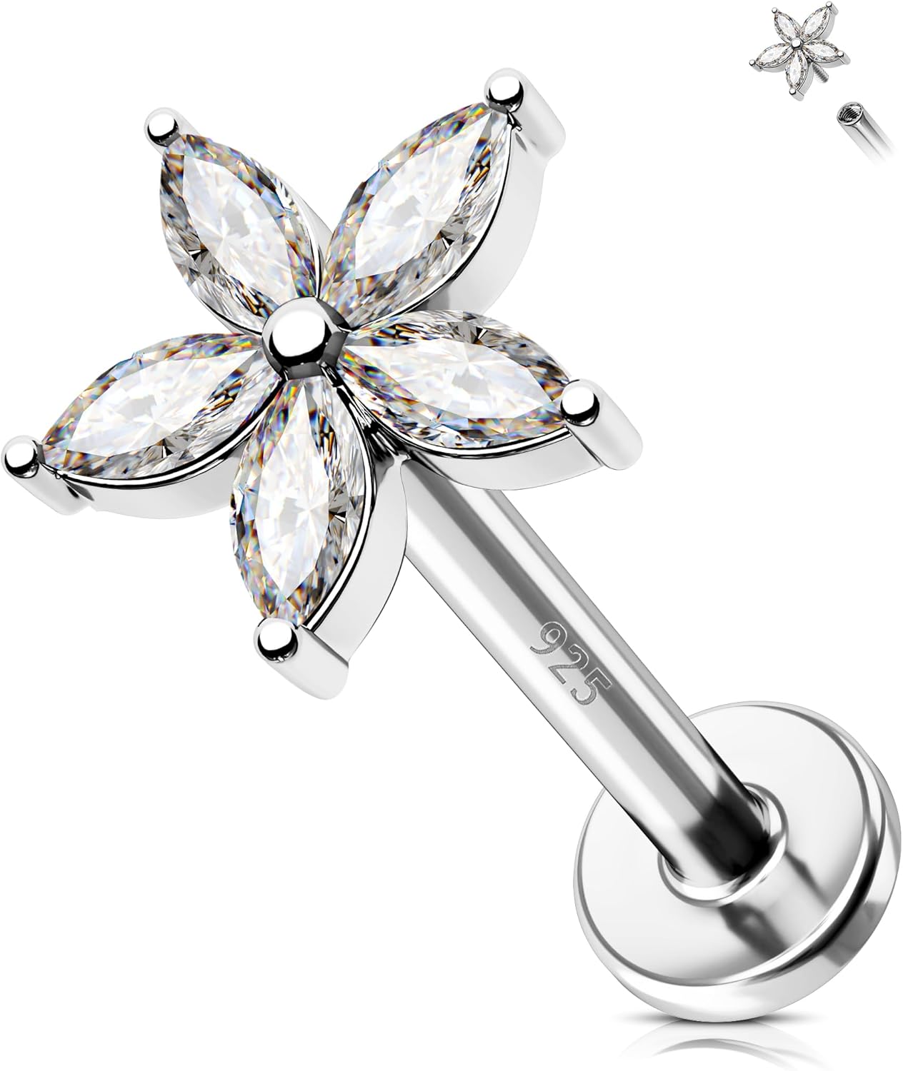 Jewseen 925 Sterling Silver Flat Back Stud Earrings 16g Internally Threaded Tragus Helix Earrings Flower Lip Stud Nose Piercing Jewelry for Women Men