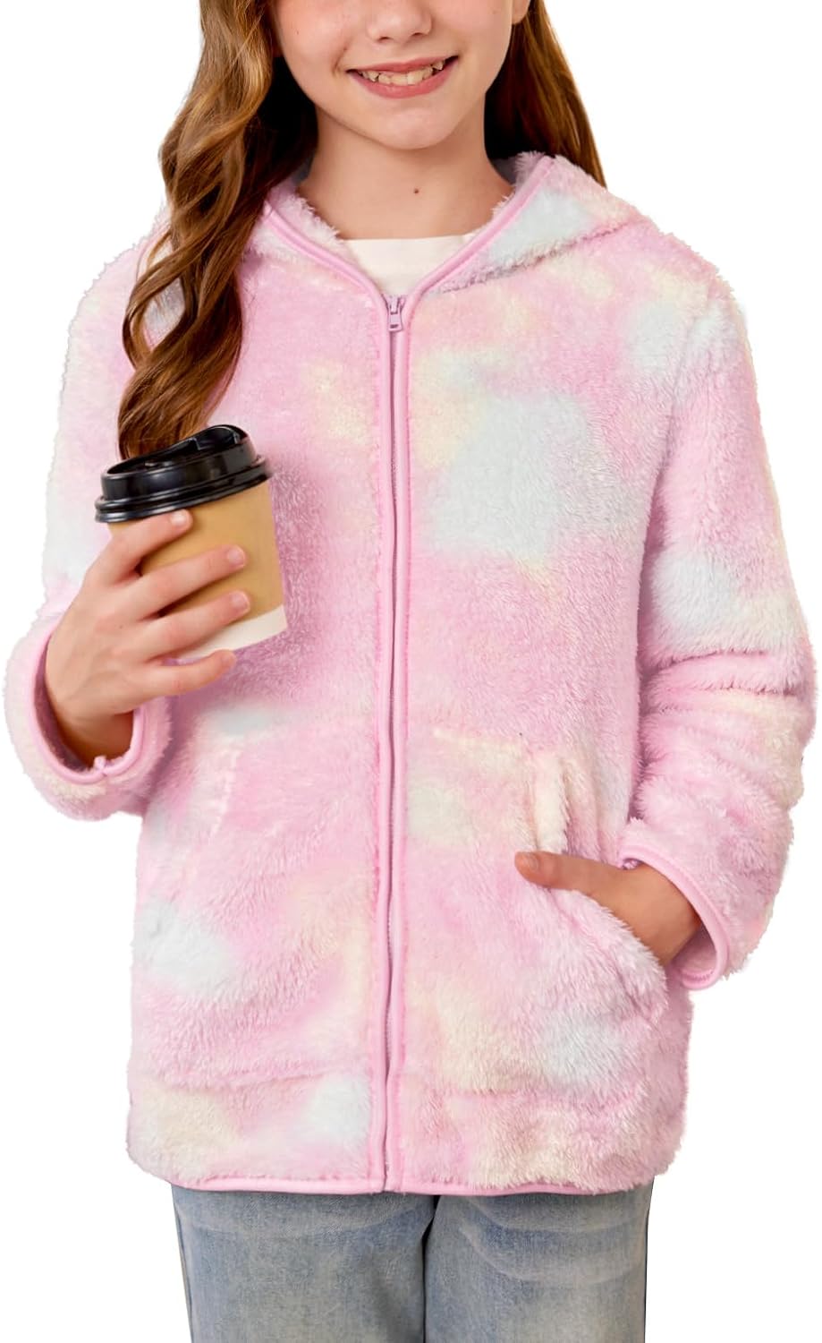 Winter Girl Casual Solf Hoodies Long Sleeve Fleece Sherpa Zipper Up Fuzzy Jacket Multicolor Tie Dye 9-10 Years