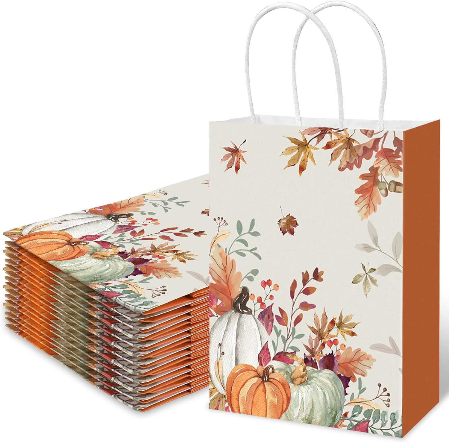 JarThenaAMCS 24Pcs Fall Gift Bags with Handle Autumn Pumpkin Leaves Treat Goodie Bag Rustic Orange Paper Party Favor Bag for Harvest Thanksgiving Baby Shower Birthday Party Favors Supplies