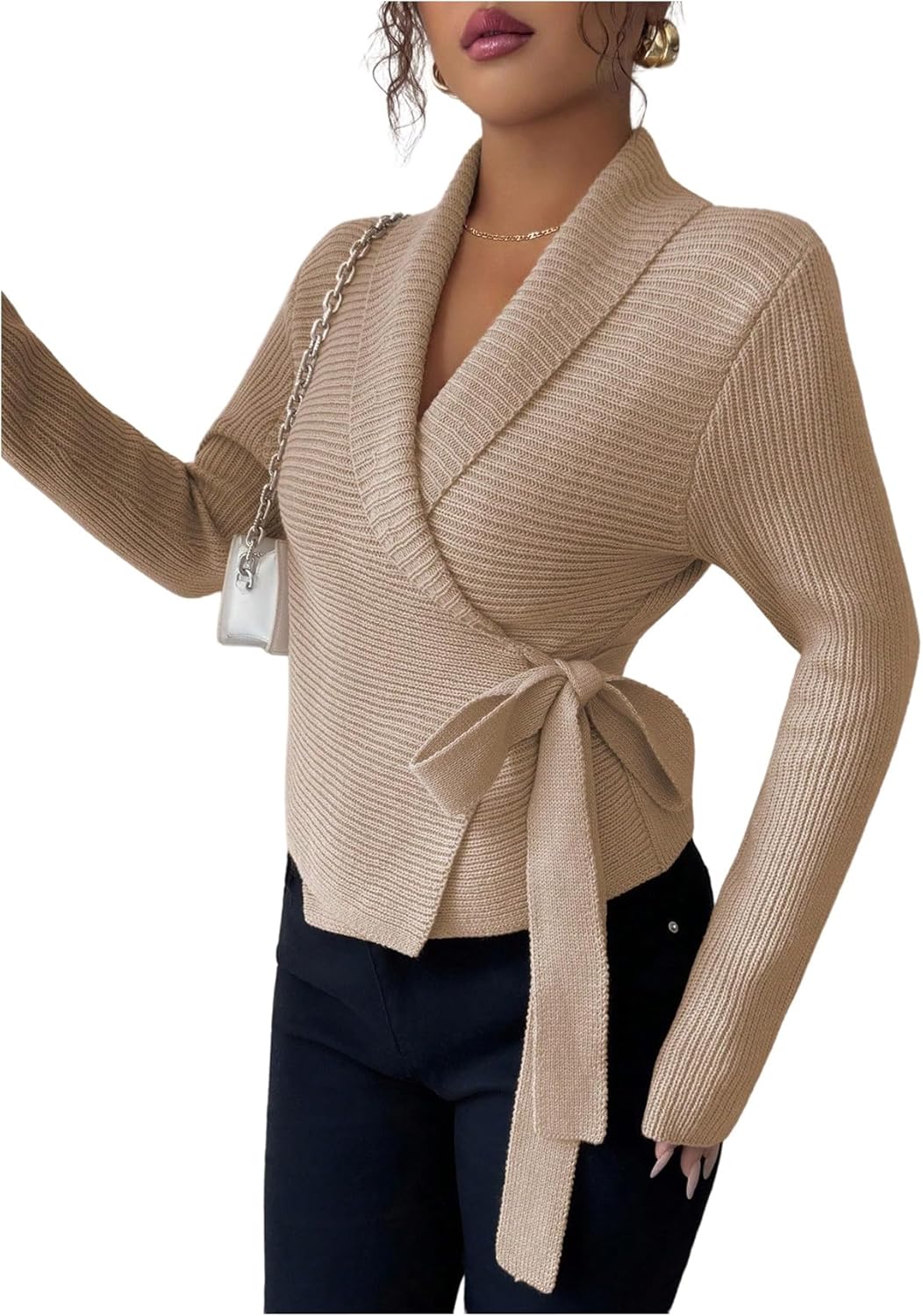 MakeMeChic Women's Business Winter Elegant Cardigan Wrap Tie Side Collared Long Sleeve Sweater