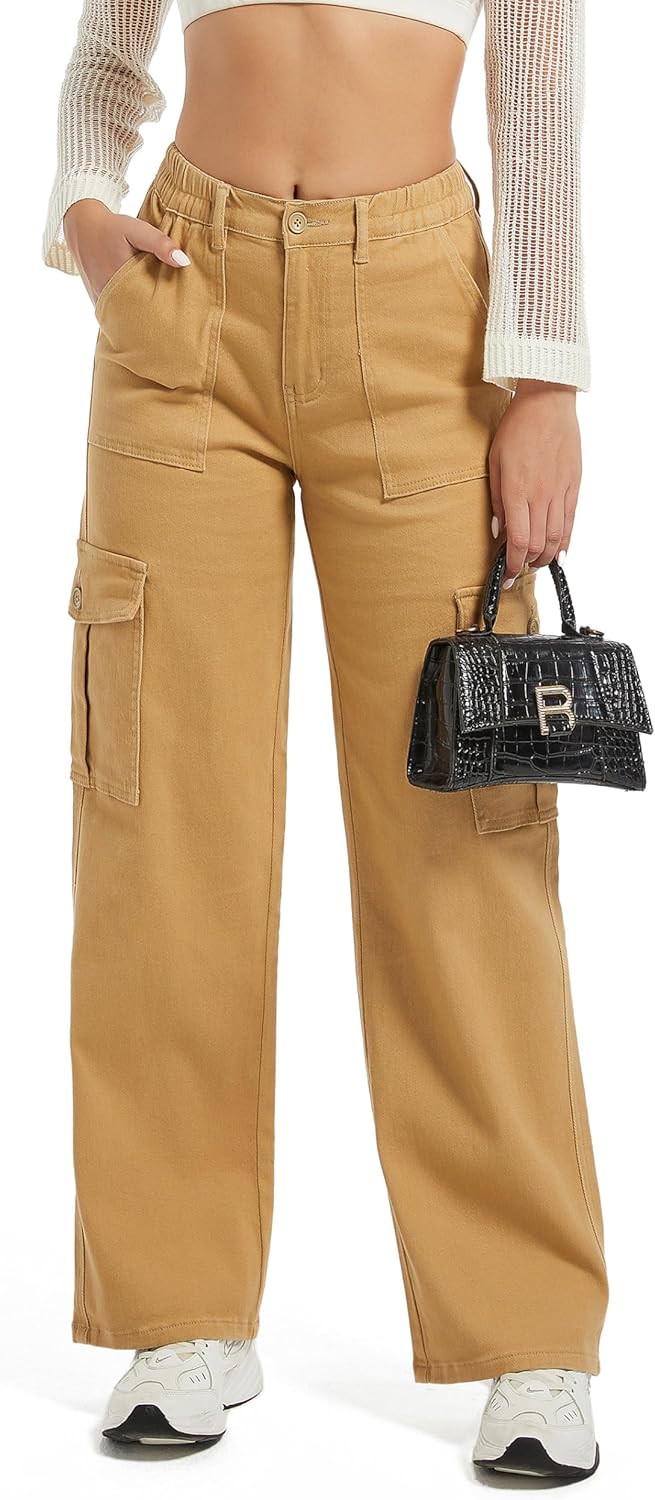 Aodrusa Brown Pants for Women High Waisted Stretch Straight Leg Cargo Pants with Pockets Trendy Trousers