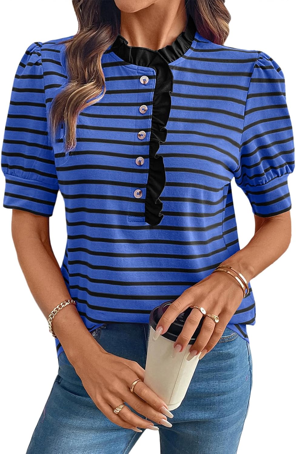BLENCOT Summer T Shirt for Women Casual Puff Sleeve Button Down Ruffle Collar Striped Knit Blouse Tops