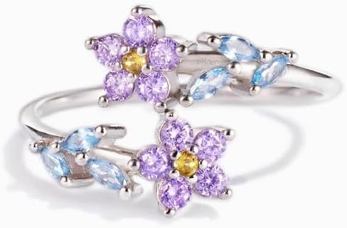 Delicate Purple Diamonds Flower Rings With Blue Cz Crystal Leaf Adjustable Open Charm Statement Promise Engagement Eternity Cubic Zircon Rings Wrap Middle Thumb Finger Gifts For Wedding Women
