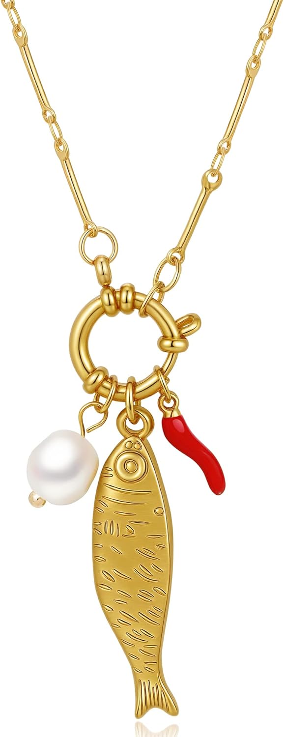 Gold Charm Necklace for Women Western Boho Jewelry, Charm Holder Carabiner Paperclip Chain Necklaces with Star Moon Horseshoe Fish Shell Pendant Charms Celestial Choker Necklaces Gift