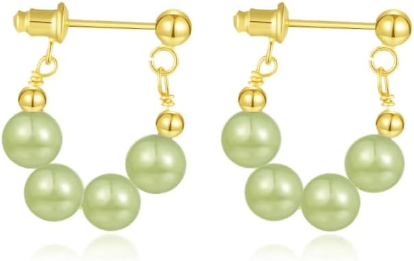 Natural Hetian Jade Earrings, White Pearls Beaded Stud Earrings for Women, Lucky Green Jade Handmade Ear Jewelry Studs Gift for Mom Lover Her
