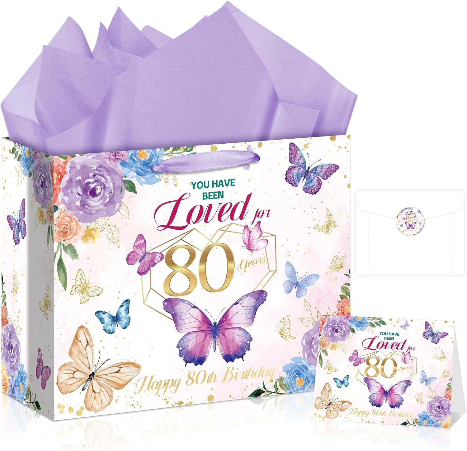 - 【Elegant 80th Birthday Design】This 80 years old birthday bag for her is designed with a light pink background, decorated with colorful butterflies, purple and blue flowers. It has the text “YOU HAVE BEEN Loved for 80 Years” and “Happy 80th Birthday” in eye-catching fonts. The greeting card and sticker are printed with the same patterns. This elegant and unique design will delight the birthday women.