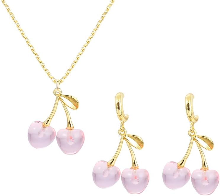 ONLYJUMP 3D Cherry Earrings Necklace Set for Women Dainty Fruit Charm Earring Pink Cherry C-shaped Hoop Earrings Lovely cherry Earring Necklace Funny Cute Fruit Jewelry Gifts