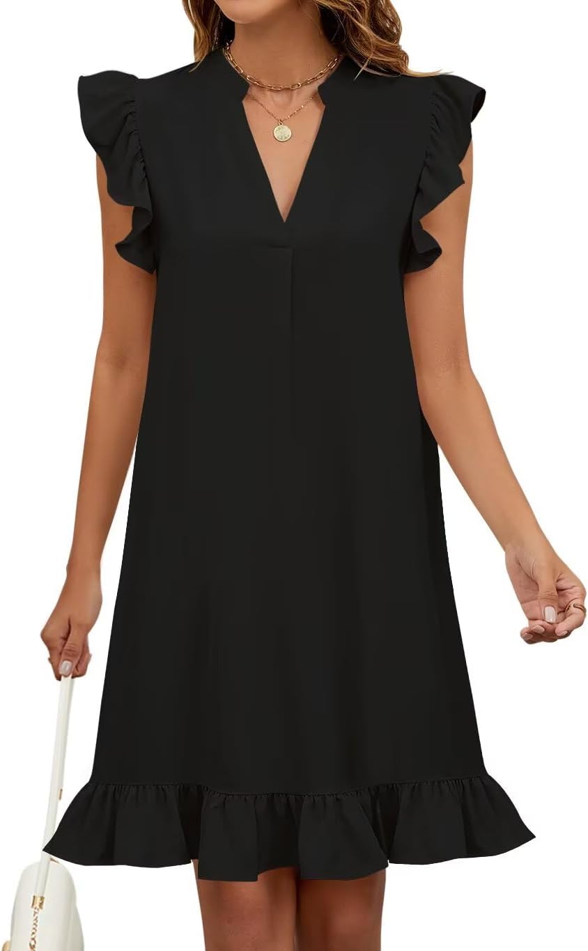 Wkior Summer Dresses for Women 2026 Casual V Neck Cap Sleeve Ruffled Hem T-Shirt Dress Flowy Swing Smock Mini Sundress