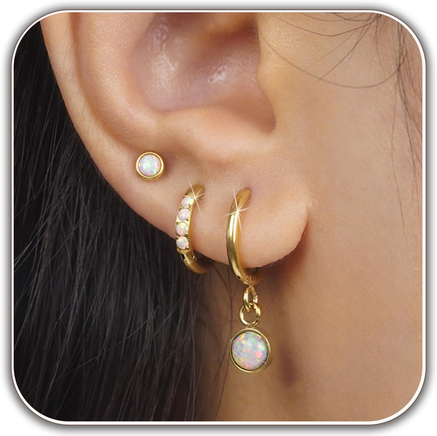 3 Pairs 14K Gold Plated Opal Earrings for Women: Dainty Opal Studs, Small Cartilage Huggie Hoops, Trendy Dangle Earrings, Hypoallergenic Gold Jewelry Set, Unique Gift for Women, Mom