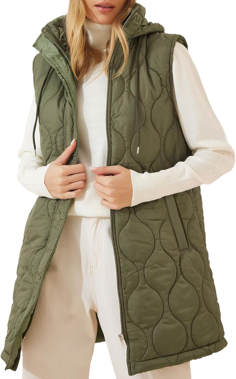 EVALESS Long Puffer Vest Women Sleeveless Hooded Puffer Jacket Lightweight Quilted Jackets Winter Warm Zip Up Coat Outerwear