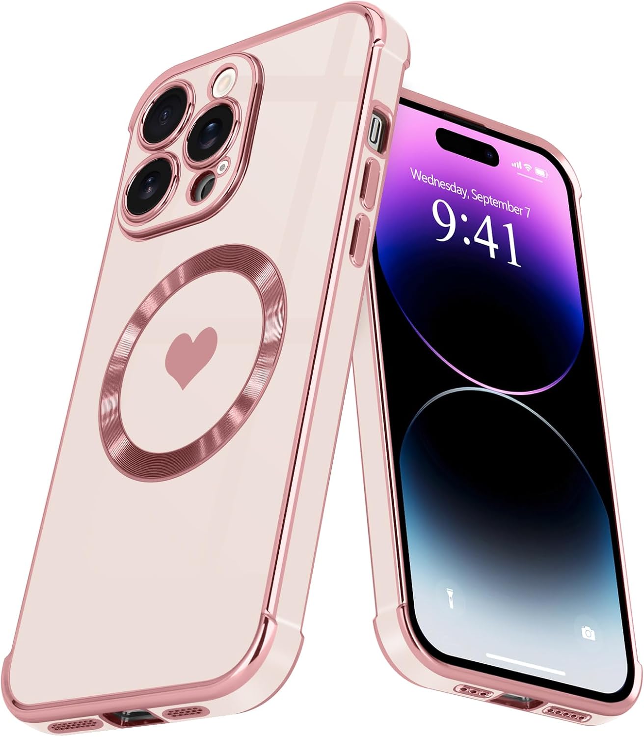 Magnetic Case for iPhone 15 Pro Max Women Girl Luxury Plating Cute Love Heart Slim Cover Full Camera Lens Protection Compatible with MagSafe for iPhone 15 Pro Max Pink