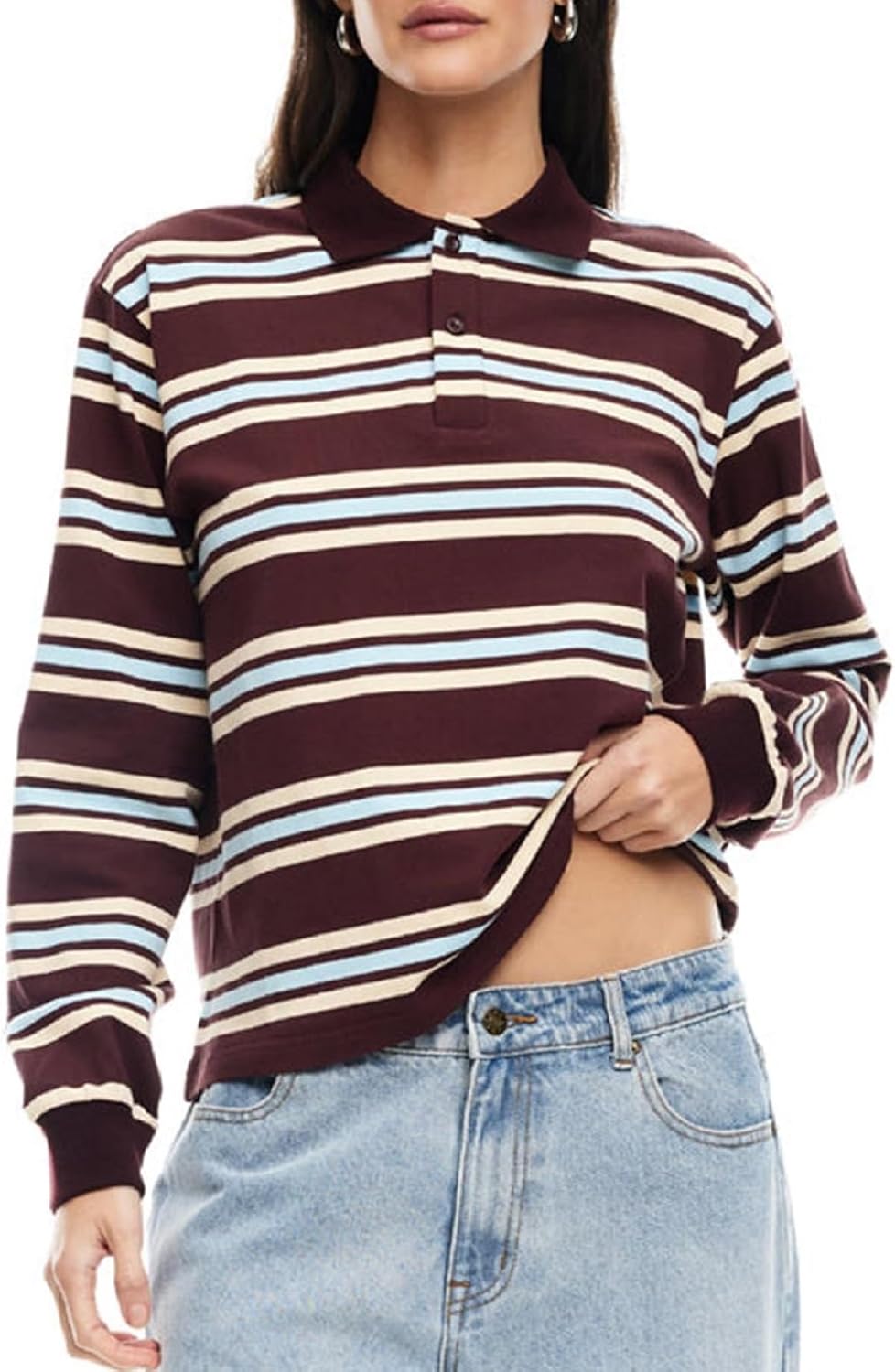 Argeousgor Women Y2k Striped Rugby Shirt Vintage Long Sleeve Collared Shirt Preppy Polo Sweatshirt Jersey Girls Streetwear