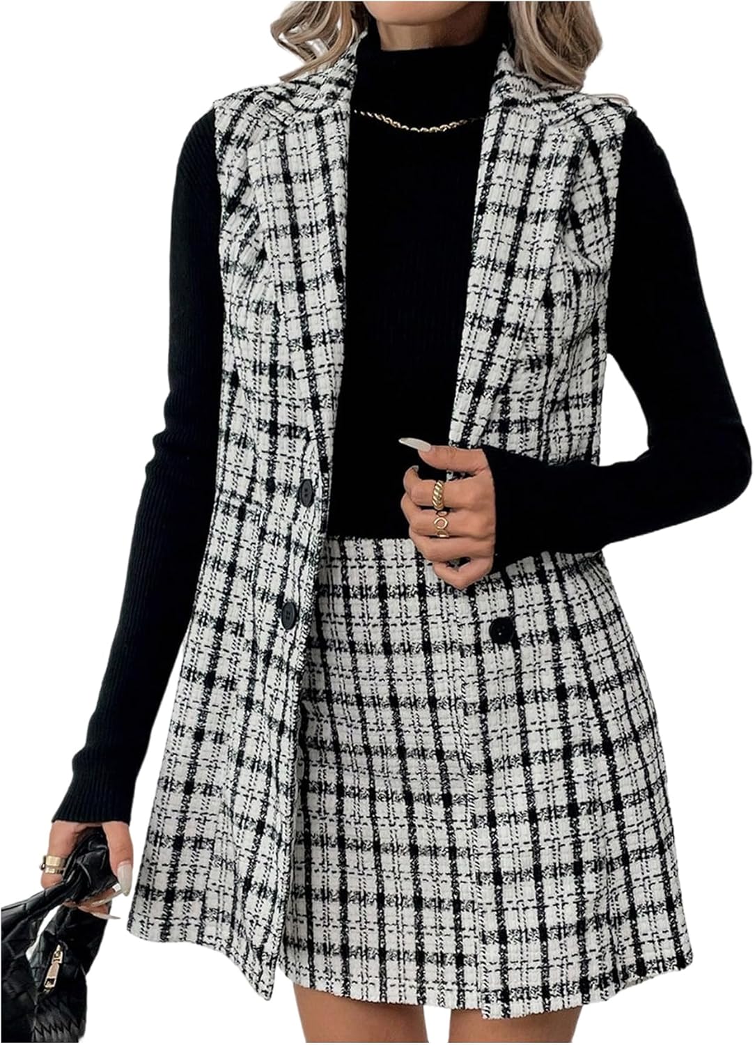 Floerns Women's 2 Piece Outfit Workwear Plaid Print Lapel Neck Vest Blazer and Skirt Set