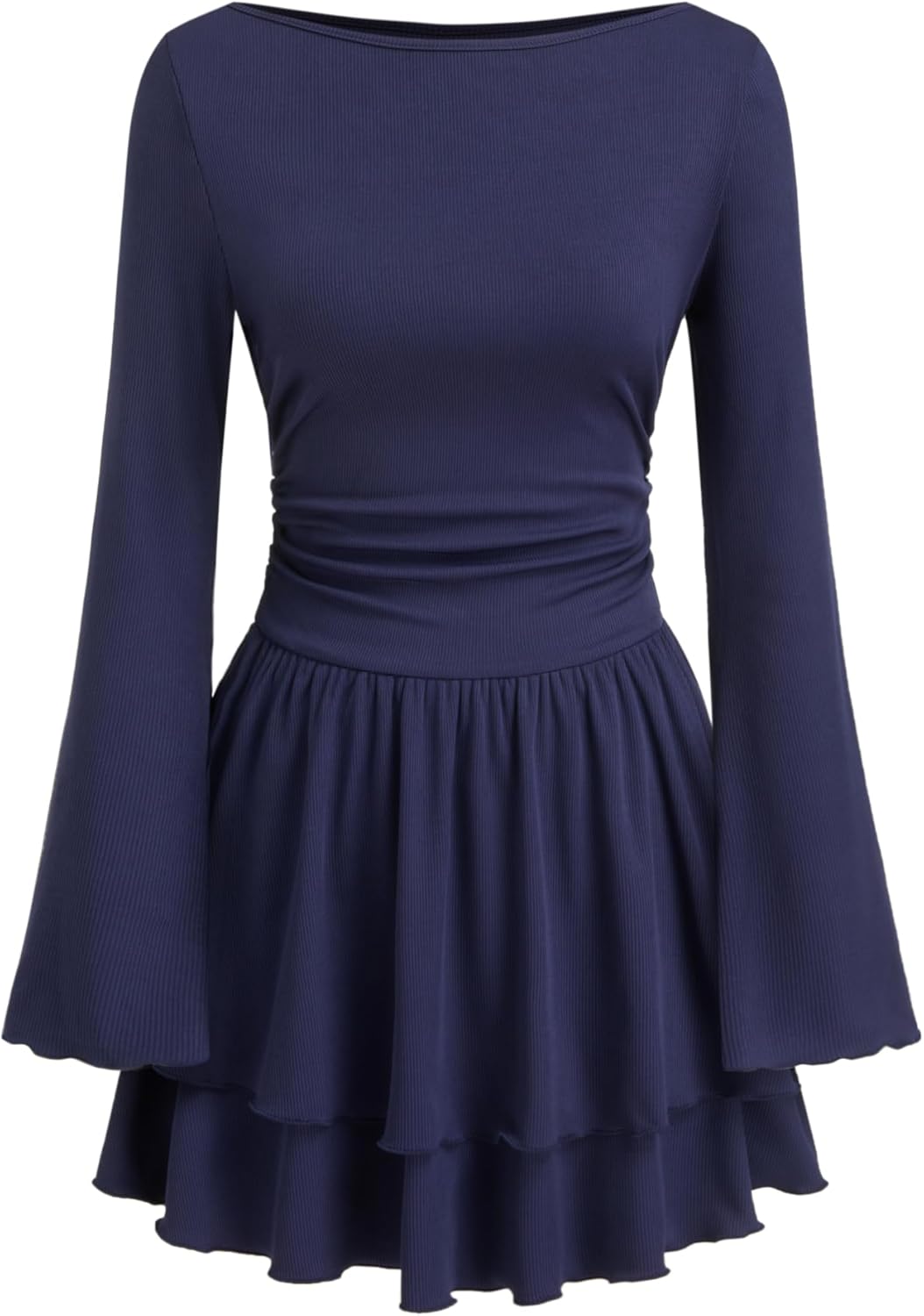 Women Boat Neck Long Sleeve Ribbed Tiered Ruffle Skater Mini Party Cocktail Dress