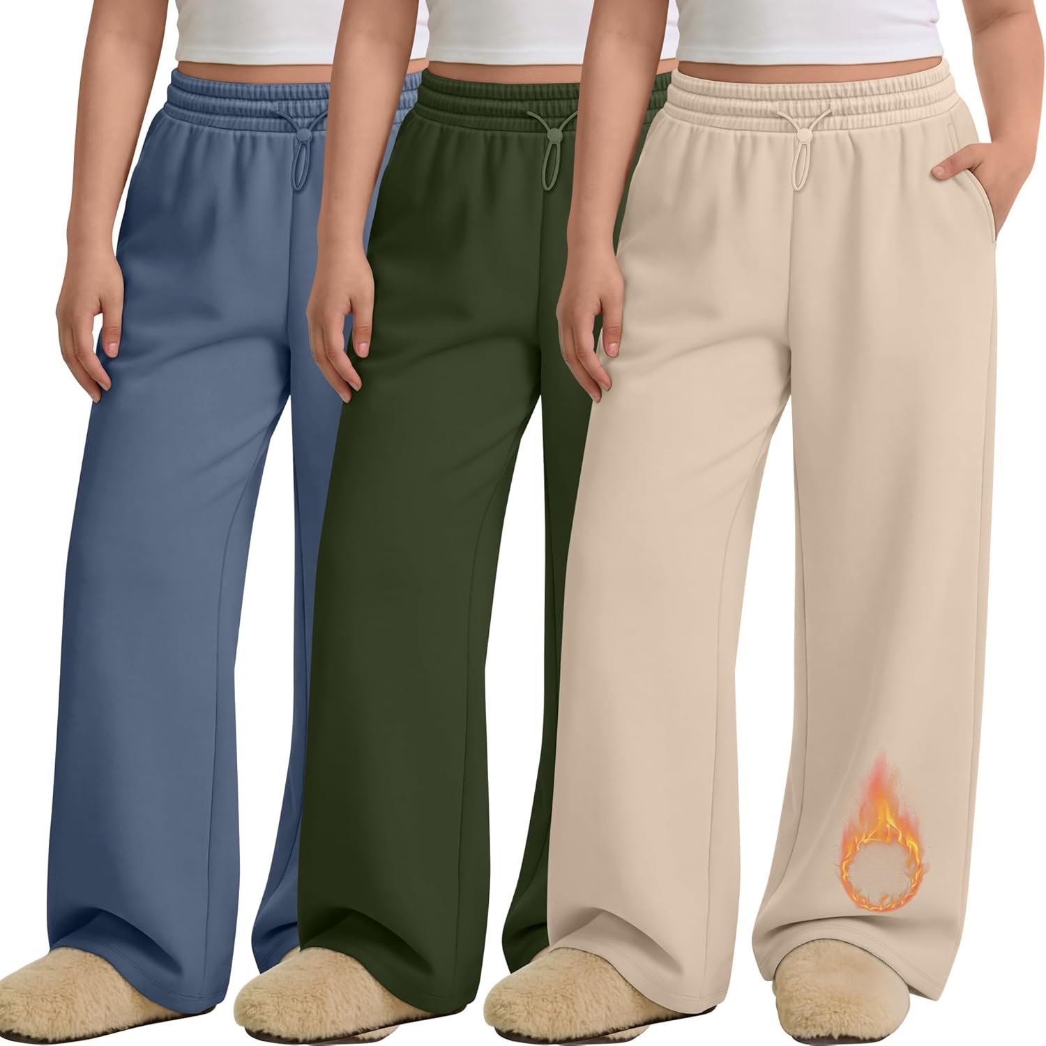 3 Pack Women's Plus Size Fleece Lined Sweatpants Wide Leg Joggers Shock Cord High Waisted Thermal Pants with Pocket