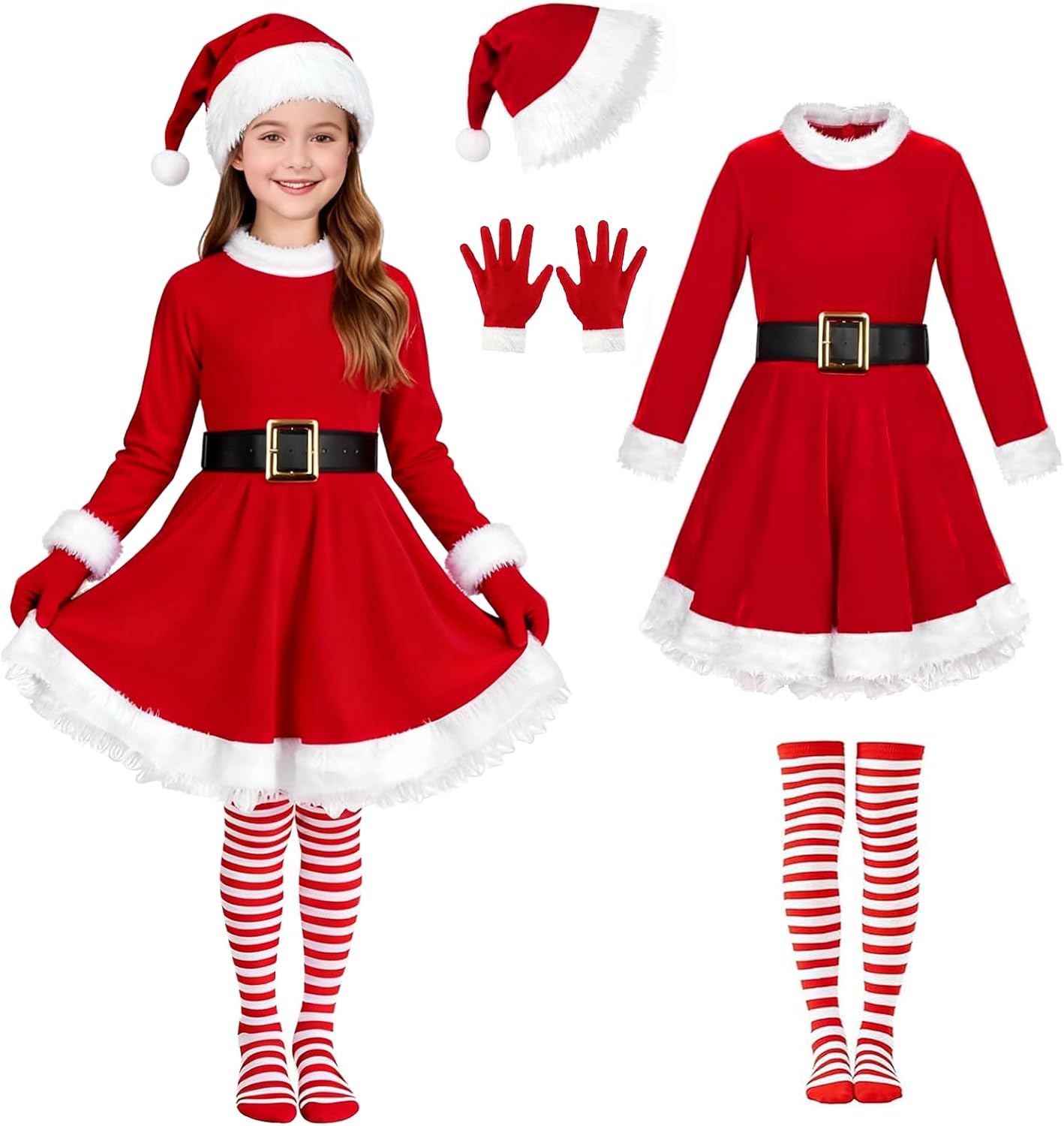 Kids Girls Santa Dress - Mrs Claus Costume Christmas Outfit with Belt Socks Hat Gloves