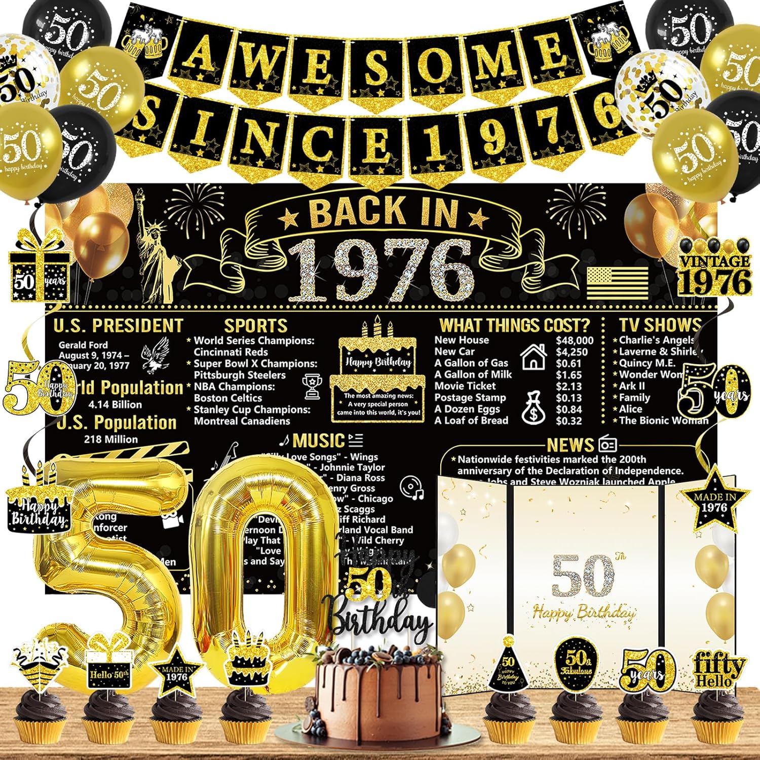 - Included Components: Vintage Black Gold 1976 Birthday Poster Banner, Black Gold Awesome Since 1976 Flag Pulling * 1, 12 inch Latex Balloon * 10, 32 inch Gold 50th Aluminum Film Balloon * 1, 6pcs Black Gold 50 Year Spiral, 8pcs Black Gold 50 Year Paper Cupcake Toppers, Black 50 Year Old Cake Toppers, Gold Digital Candles 50 * 1, and Black Gold 1976 Birthday Poster Signature Certificate * 1