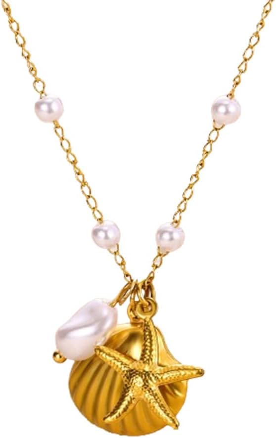 Shell Starfish Pearl Necklace Imitation Pearl Chain Necklace Gold Sea Shell Star Necklace Pendant for Women Dainty Summer Holiday Beach Surfer Jewelry Gift