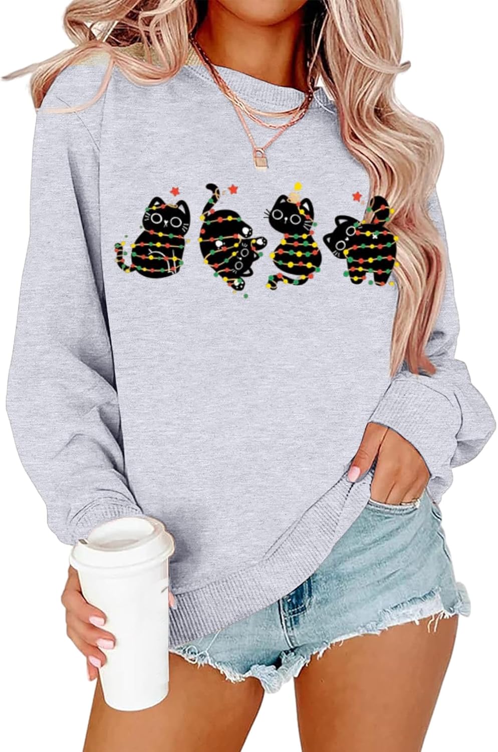 Yarayasa Women Christmas Cat Sweatshirt Holiday Pullover with Black Cats Christmas Tree Light Graphic Long Sleeve Xmas Top