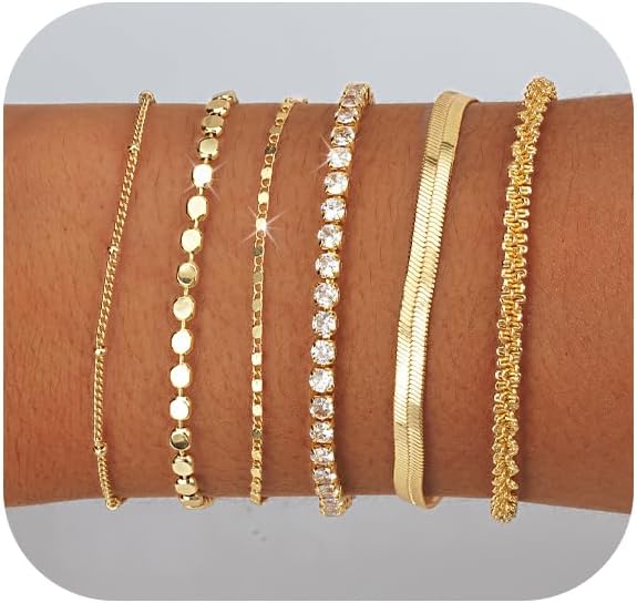 Gold Bracelets for Women 14K Gold Plated Stack Trend Bracelets Charm Paperclip Chain Cuban Link Layered Waterproof Bracelet Dainty Bracelet for Women Jewelry Gifts