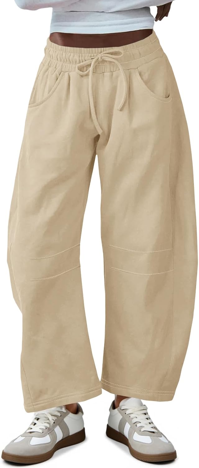 Fisoew Womens Barrel Leg Sweatpant Drawstring Elastic Waisted Wide Leg Pants Casual Active Pants with Pockets