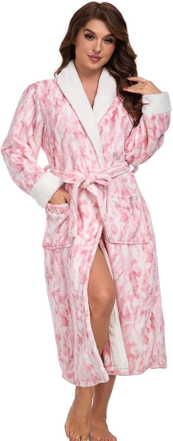 RONGTAI Plush Fleece Bathrobe for Women, Long Robe with Two Side Pockets and Belt, Warm and Cozy Fluffy Sleepwear Nightgown