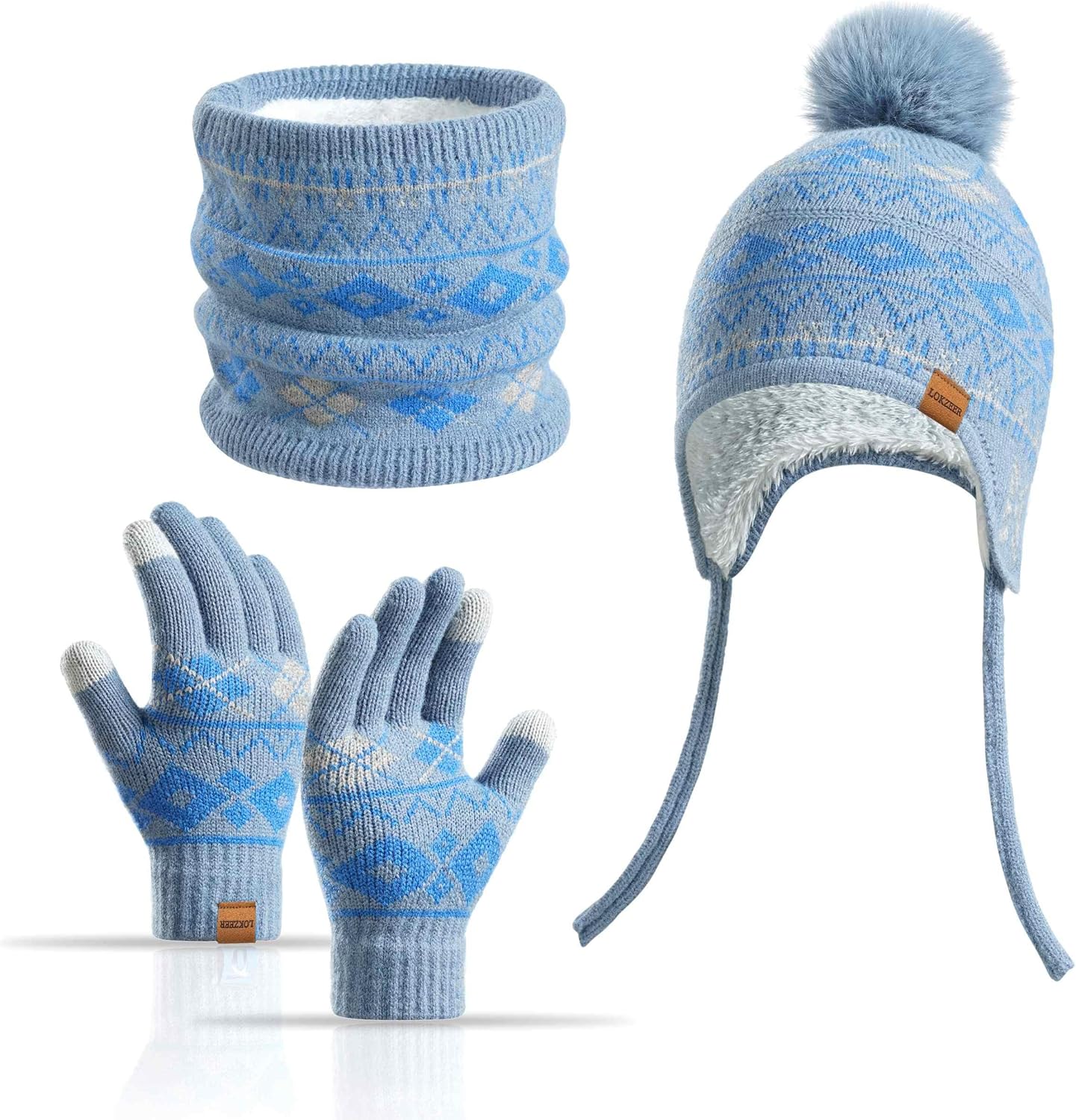 Kids Winter Hat Scarf Gloves Set with Earflaps: Warm Beanie Hat, Neck Warmer & Touchscreen Gloves for Boys and Girls