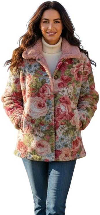 Women's Vintage Floral Fleece Coat Boho Colorful Floral Graphic Print Cozy Warm Lapel Button Down Jacket with Pockets