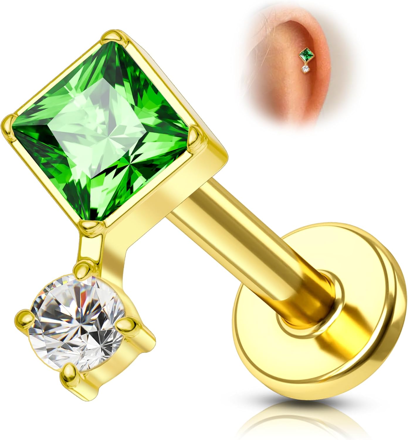 COCHARM 16G Titanium Flat Back Helix Piercing Jewelry, Square Design Threadless Cartilage Tragus Earring Stud, Gold and Silver Tone Conch Lobe Jewelry