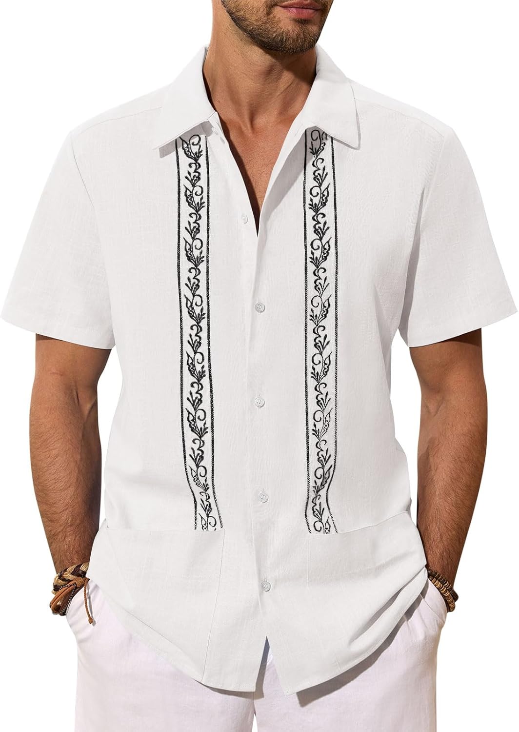 Mens Cuban Guayabera Shirts Cotton Linen Short Sleeve Shirt Casual Hippie Beach Button Down Pocket Shirt