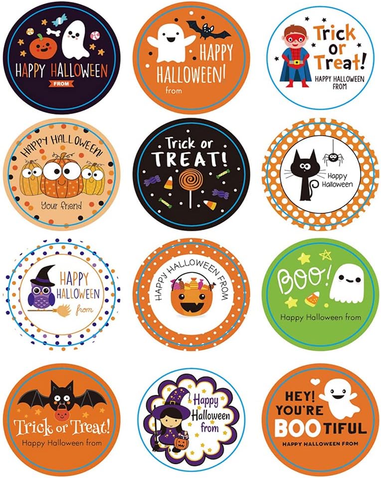 - 【Package Including】10 Sheets Beautiful stickers for Happy Halloween with 12 kinds of different design and each sticker around 1.18 inch(3cm)diameter, total in 120pcs. Enough stickers can be use for Halloween party favors, trick or treat candy bag decoration, school parties and many more, a nice non-food treat to hand out to the kids on Halloween.