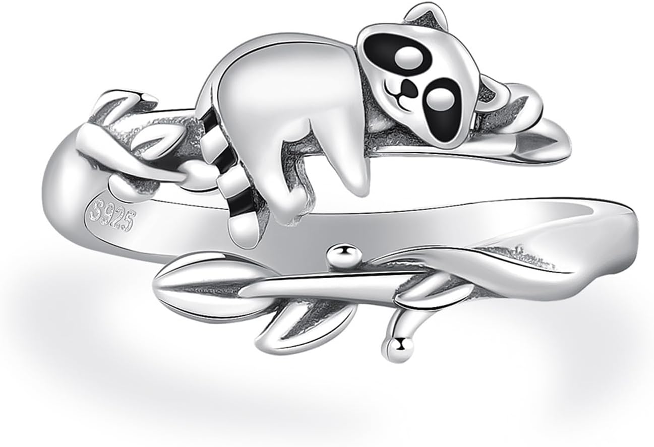 925 Sterling Silver Raccoon Ring - Cute Animal Adjustable Rings Raccoon Gifts Jewelry for Women