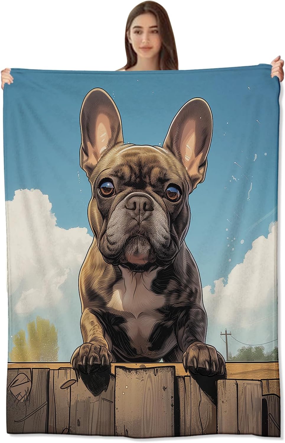 - [Artistic French Bulldog Design]Adorning this cozy throw is a whimsically illustrated French Bulldog, peering over a wooden fence with soulful eyes that exude personality. The artistic rendering captures the dog's curious nature against a backdrop of a clear blue sky and fluffy clouds, offering a snapshot of a serene day that pet lovers will adore.