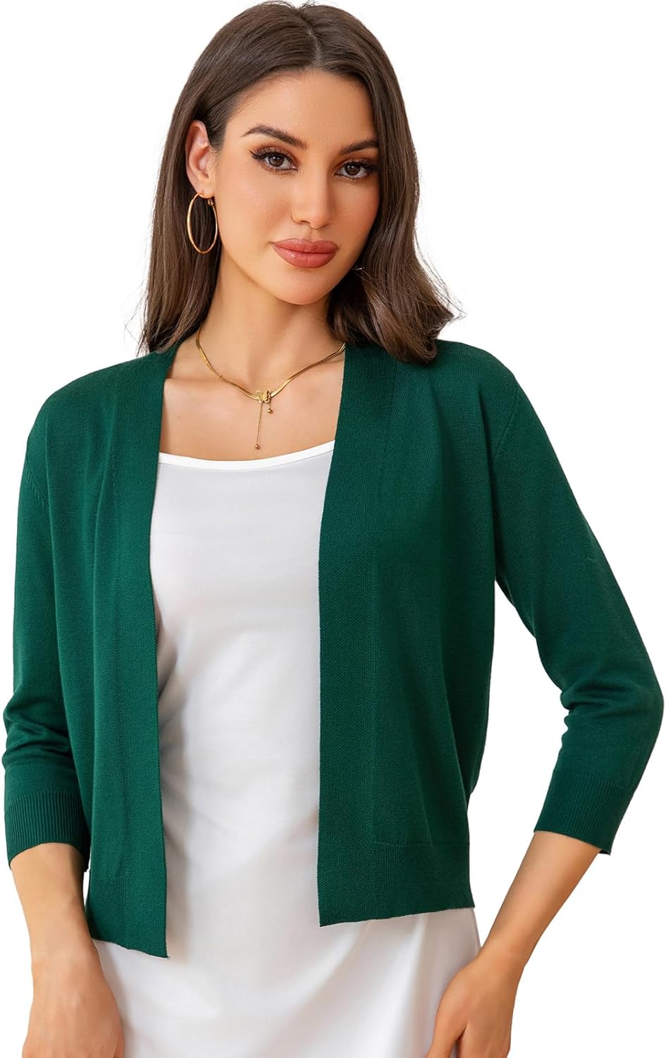 Women's Cropped Open Front Knit Cardigan V-Neck 3/4 Sleeve Lightweight Bolero Short Shrugs Sweaters Tops