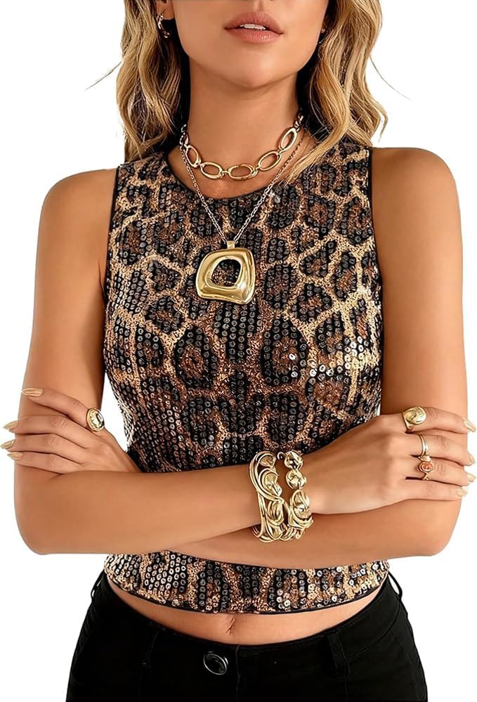 Womens Sequin Cheetah Print Sleeveless Tank Top Glitter Shiny Party Clubwear Camisole