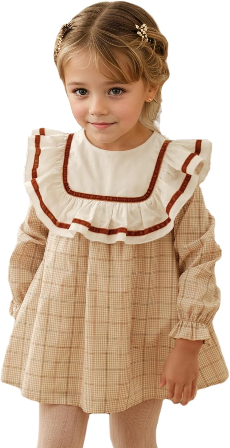 Twoflower Toddler Girls Vintage Plaid Dress | Soft Cotton Princess Ruffle Dress with Bow | Long Sleeve Fall Heirloom Outfit