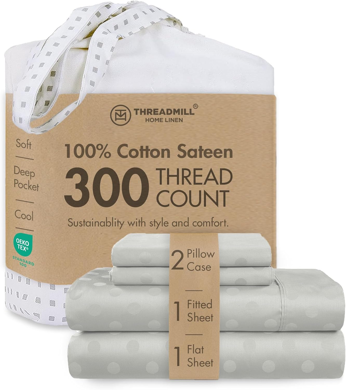 - LIGHTWEIGHT BEDDING SET WITH SNUGLY FITTING DEEP POCKET BOTTOM SHEET: Enjoy breezy nights and forget night sweats with our cooling and airy 300 thread count sheets. Each 4 piece Queen sheet set includes 1 flat sheet (92" W x 104" L), 1 fitted sheet (60" W x 80" L + 16" deep pocket) and 2 Standard pillowcases (20" W x 30" L). Designed to snugly fit your mattress, the elasticized bottom sheet comes with a sizable deep pocket and stays tucked through the night.