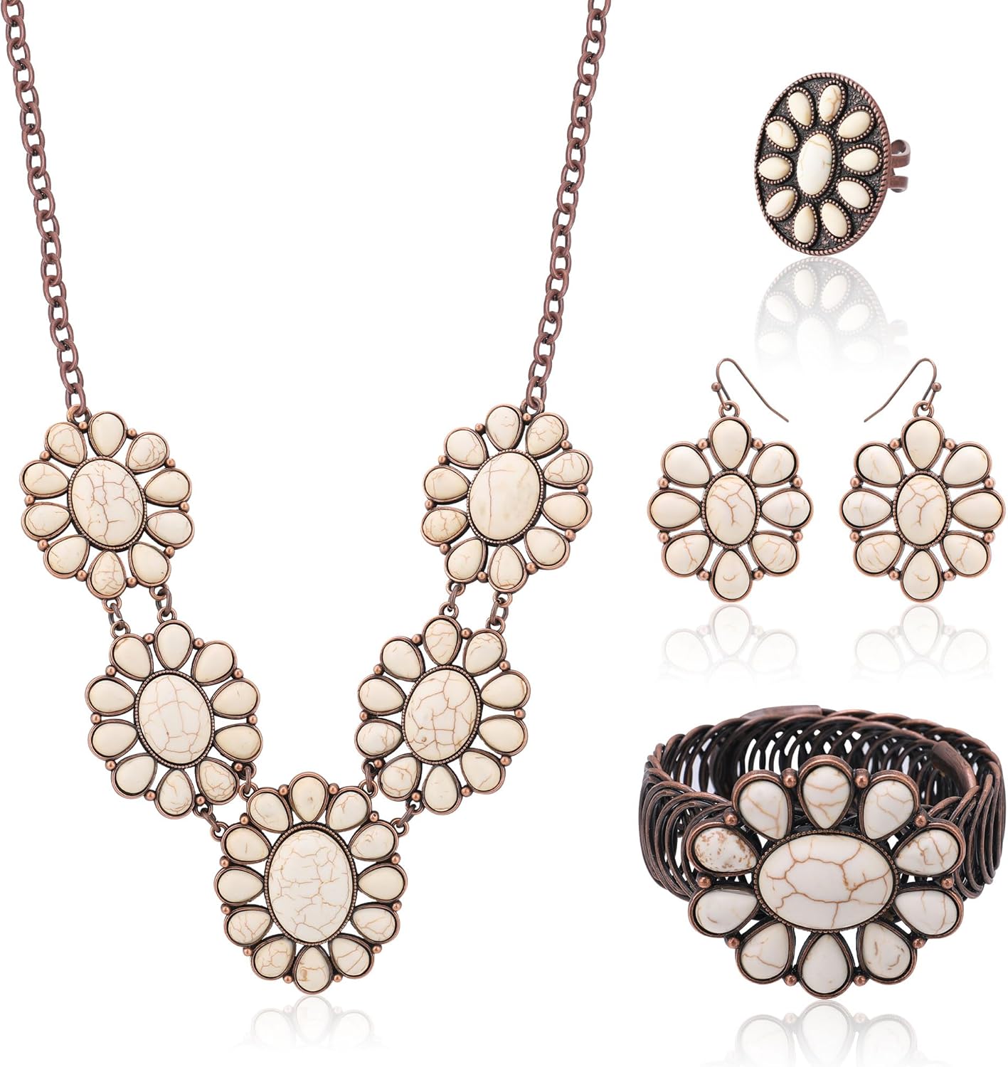 4 PCS Western Turquoise Jewelry for Women Boho Vintage Navajo Pearl Necklace Earring Bracelet Ring Set Country Cowgirl Accessories for Gift