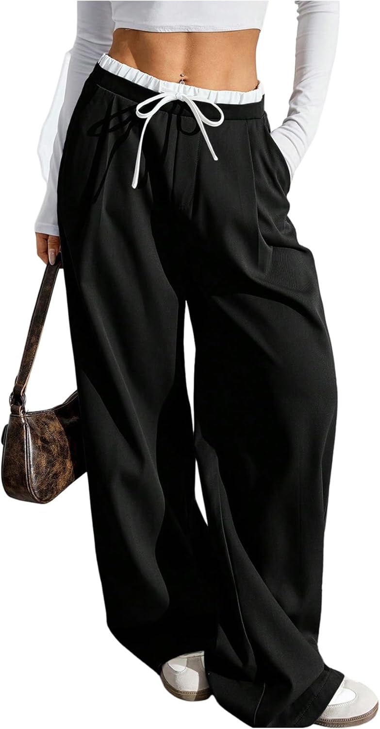 Verdusa Women's Streetwear Wide Leg Pants Drawstring Waist Long Trousers with Pockets